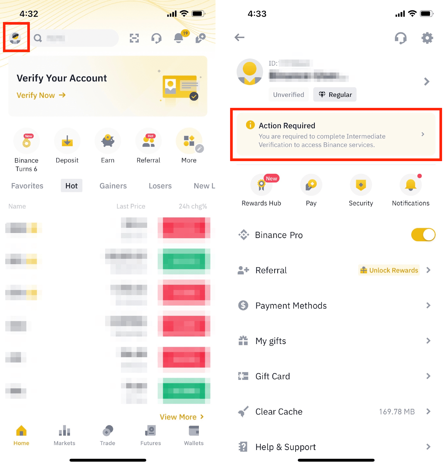 您可以通过【账户】-【身份认证】,或点击首页的【完成验证】或【验证】访问身份认证页面。在该页面可以查看当前认证级别,它决定了您的账户在币安的交易限额。如需提升额度,请依次完成各个级别的身份认证。