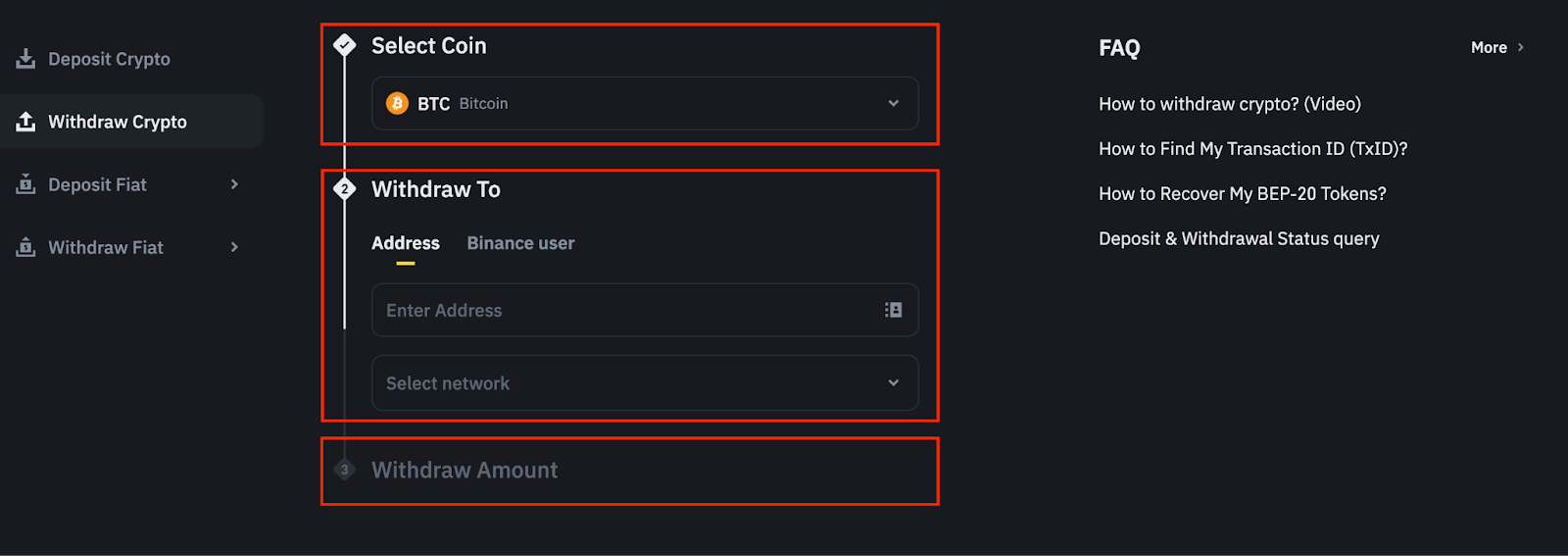 3. 输入您的提币地址并选择正确的网络。输入提现金额。